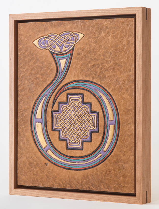 Illuminated letter "B" adapted from Book of Kells, f193r. Ireland, 9th C. Collection of Trinity College Dublin. Hand tooled leather, stain, acrylic paint, cherry, peruvian walnut, birch plywood. B_GDP9822