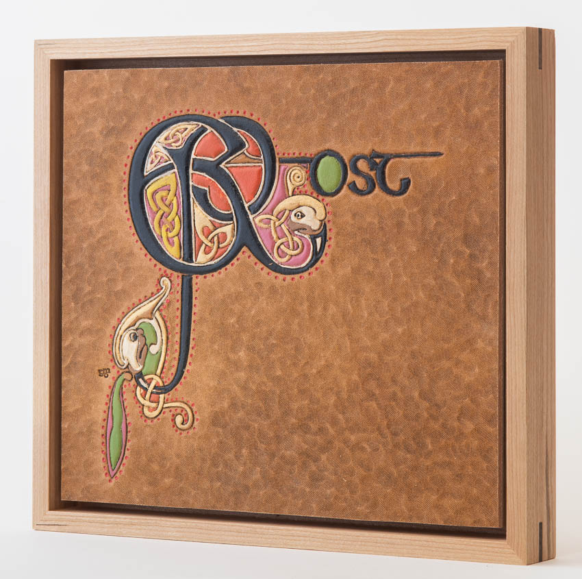 Illuminated word jumble "Et Post" (and then) adapted from Book of Kells, f278v. Ireland, 9th C. Collection of Trinity College Dublin. Hand tooled leather, stain, acrylic paint, cherry, peruvian walnut, birch plywood. EtPost_GDP9826