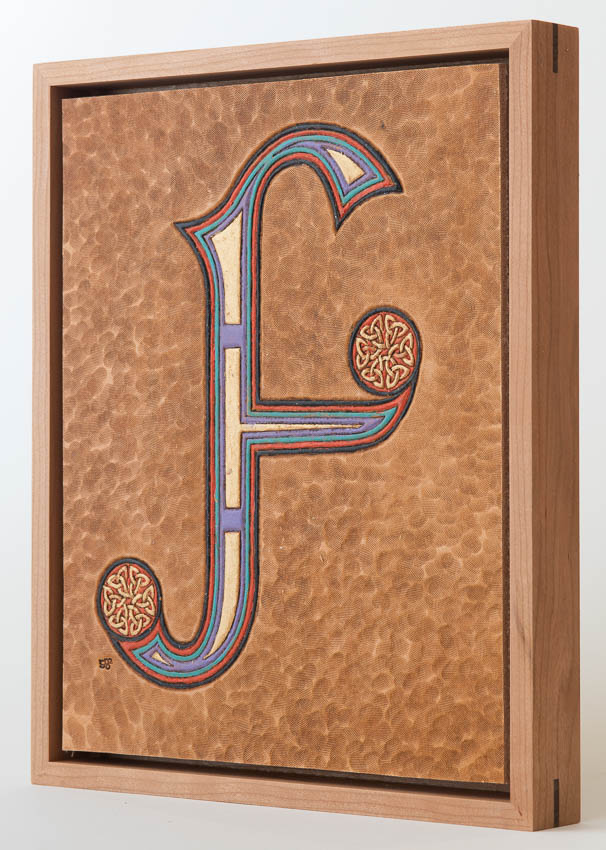 Illuminated letter "F" adapted from Book of Kells, f194r. Ireland, 9th C. Collection of Trinity College Dublin. Hand tooled leather, stain, acrylic paint, cherry, peruvian walnut, birch plywood. F_GDP9852