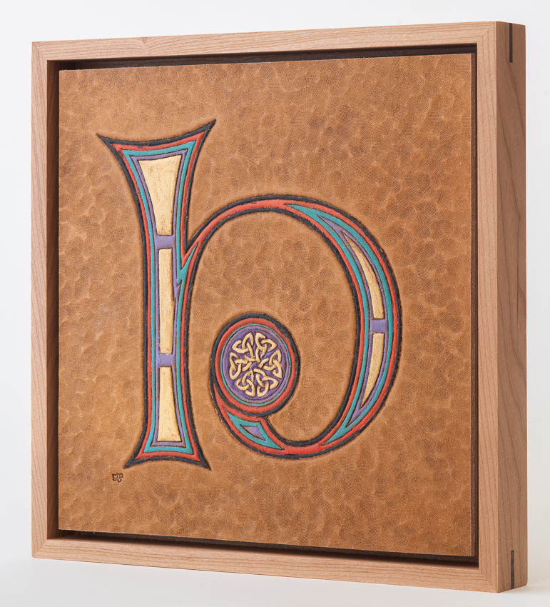 Illuminated letter "H" adapted from Book of Kells, f217r. Ireland, 9th C. Collection of Trinity College Dublin. Hand tooled leather, stain, acrylic paint, cherry, peruvian walnut, birch plywood. H_GDP9824