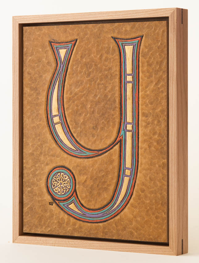 Illuminated letter "Y" adapted from Book of Kells, f34r. Irish, 9th C. Collection of Trinity College Dublin. Materials: Leather, stain, acrylic paint, cherry, peruvian walnut, birch plywood,. Y_GDP9800
