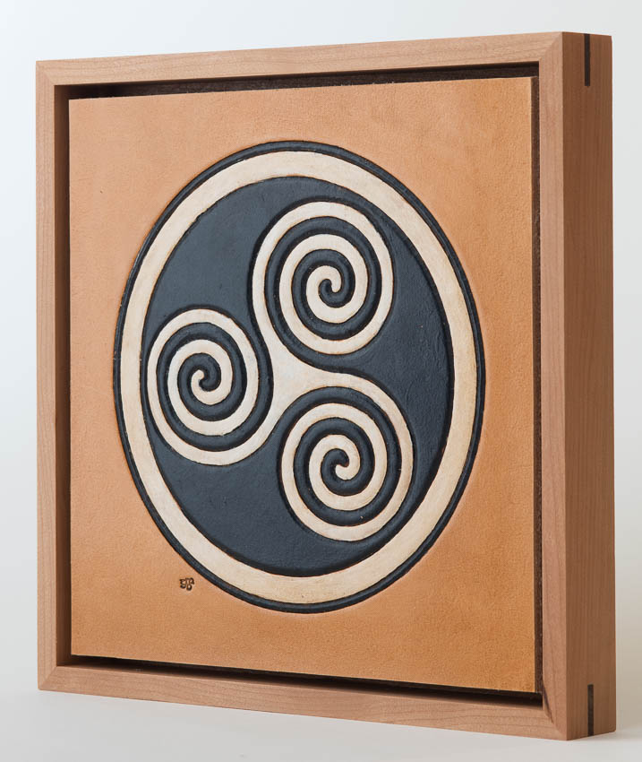 La Tène triskele from a bronze sword. Found in England, 300 BCE. Hand tooled leather, stain, acrylic paint, cherry, cambia poplar, birch plywood. _GDP9586