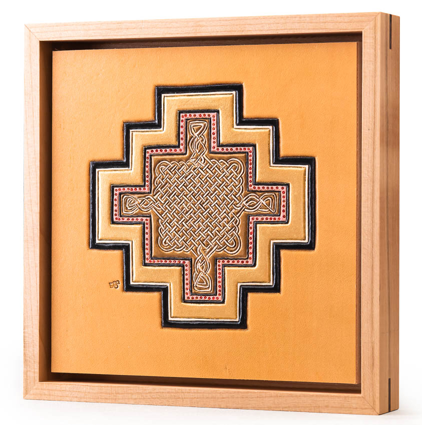 Knotwork panel adapted from Book of Kells, f34r. Ireland, 9th C Collection of Trinity College Dublin. Materials: Hand tooled leather, stain, acrylic paint, cherry, cambia poplar, birch plywood. _GDP8471
