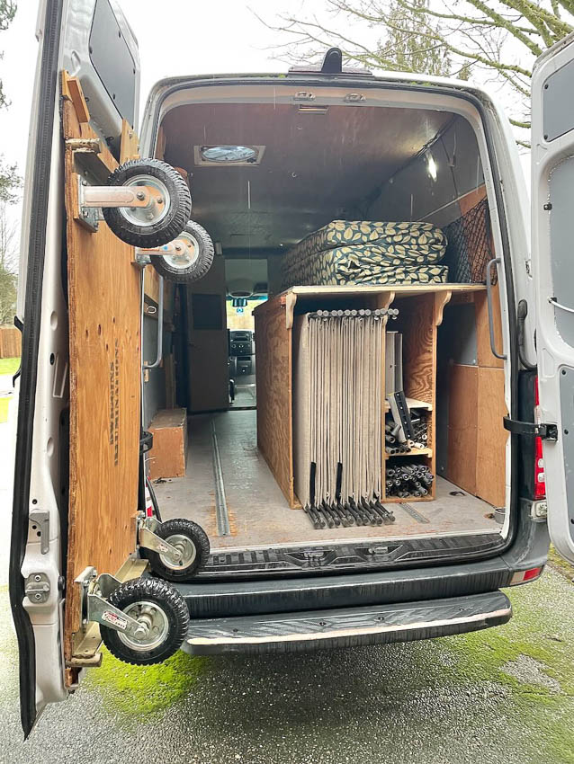 Box holds 12 ProPanels plus handles for trolley. The trolley, shown mounted on the back door, has removable handles, and fits thru a normal doorway. But can move all the ProPanels at once. truck - 17 of 27