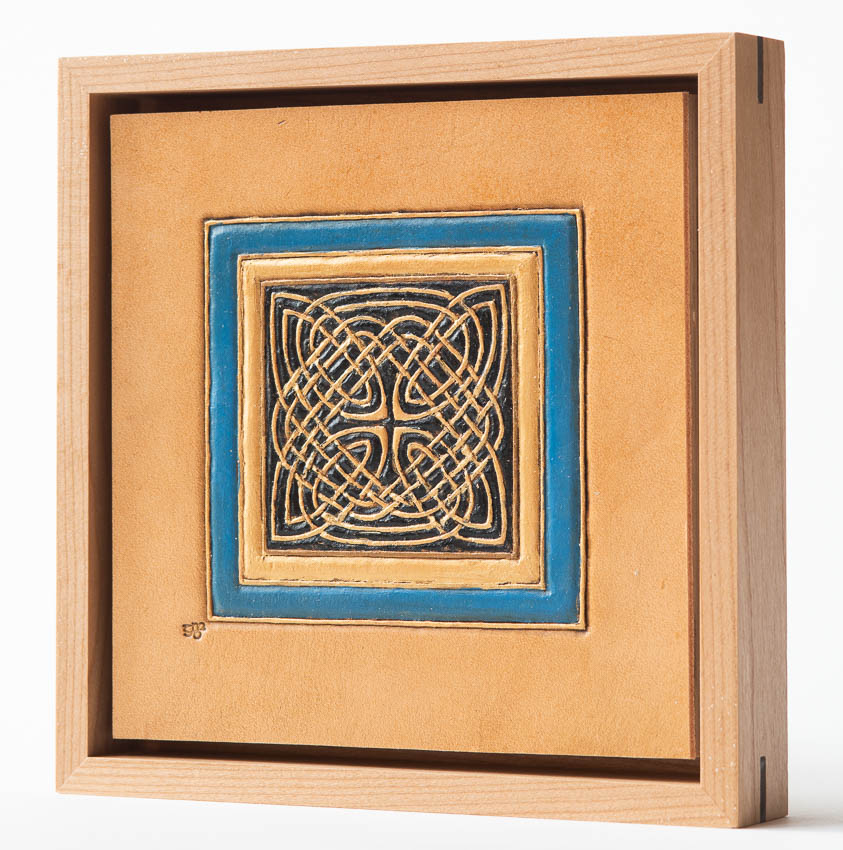 Knotwork panel adapted from Book of Kells, f2r. Ireland, 9th C. Collection of Trinity College Dublin. Hand tooled leather, stain, acrylic paint, cherry, peruvian walnut, birch plywood. _GDP9863