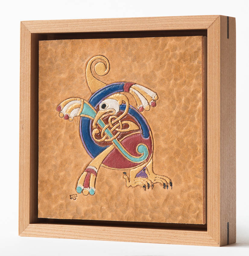 Illuminated bird from Book of Kells, f115v Irish, 9th C. Collection of Trinity College Dublin. Hand tooled leather, stain, acrlyic paint, cherry, cambia poplar, birch plywood. _GDP9865