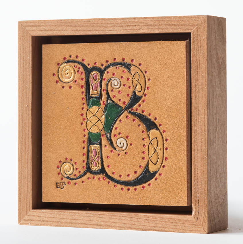 Illuminated letter "B" from Vespasian Psalter, f126v. English, 8th C. Collection of British Library. Hand tooled leather, stain, acrlyic paint, cherry, birch plywood. b_GDP9874