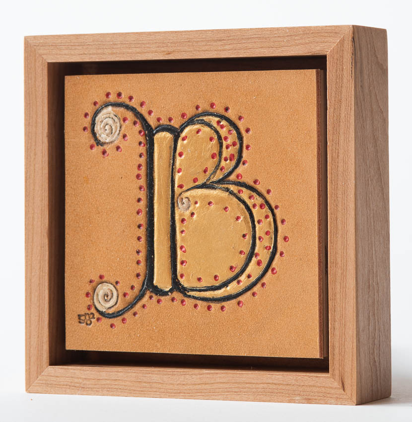 Illuminated Letter "B" from Vespasian Psalter, f118v. England, 8th C. Collection of British Library. Hand tooled leather, acrylic paint, cherry, birch plywood. b_GDP9875