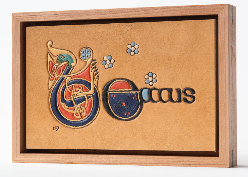 Illuminated word "Beatus" (blessed) from the Book of Kells, f40v. Ireland, 9th C. Collection of Trinity College Dublin. Hand tooled leather, stain, acrylic paint, cherry, peruvian walnut, birch plywood. beatus_GDP9855