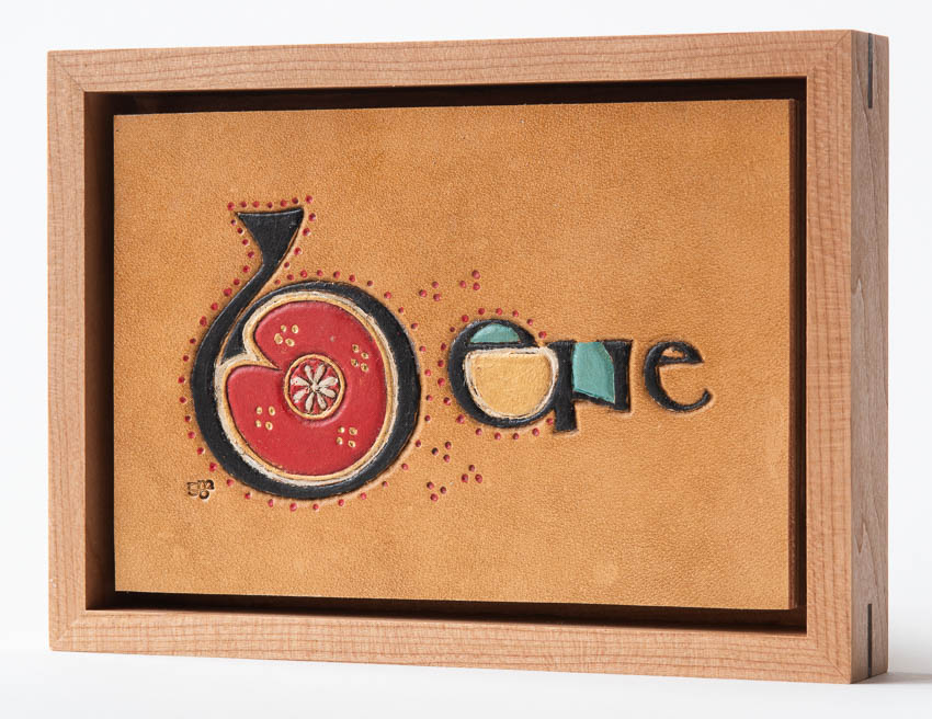 Illuminated word "Bene", meaning good, from the Book of Kells, f191v. Irish, 9th C. Collection of Trinity College Dublin. Hand tooled leather, stain, acrylic paint, cherry, birch plywood, bene_GDP9856