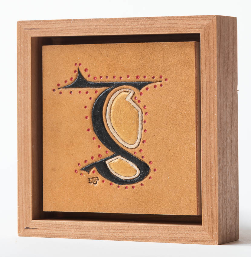 Illuminated Letter "G" from Book of Kells, f119v. Ireland, 9th C. Collection of Trinity College Dublin. Hand tooled leather, stain, acrylic paint, cherry, birch plywood. g_GDP9877