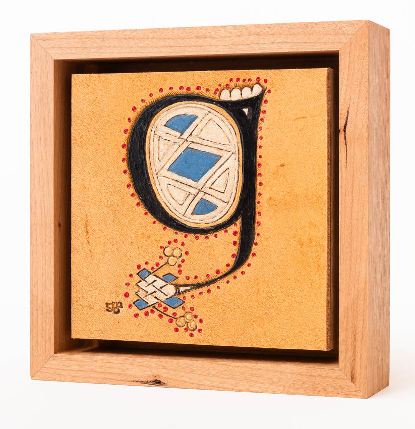 Illuminated Letter from Book of Kells, f294r. Ireland, 9th C, collection of Trinity College Dublin. Materials: Hand tooled leather, stain, acrylic paint, cherry, birch plywood. q_GDP9330