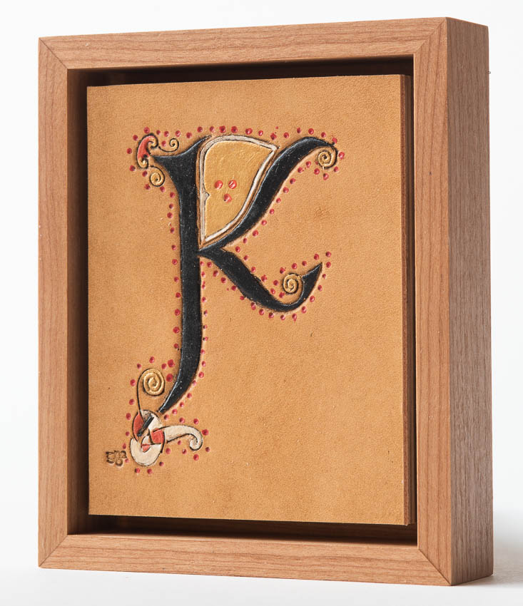 Illuminated letter "K", adapted from Echternach Gospel Book, f177r. Ireland, 7th C. Collection of Bibliothèque Nationale, Paris. Hand tooled leather, stain, acrylic paint, cherry, birch plywood. k_GDP9804